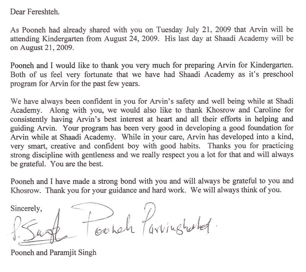 Dear Mr. Khosrow, Ms. Fereshteh and Ms. Lily,We write this letter with immense gratitude and appreciation for all the wonderful things you have taught Arteen. When he joined Shadi Academy as a 16 months-old, we could only hope he would grow into the active, well-behaved, and caring boy he is today, now ready for kindergarten. We are deeply thankful for the time he has spent in your care.