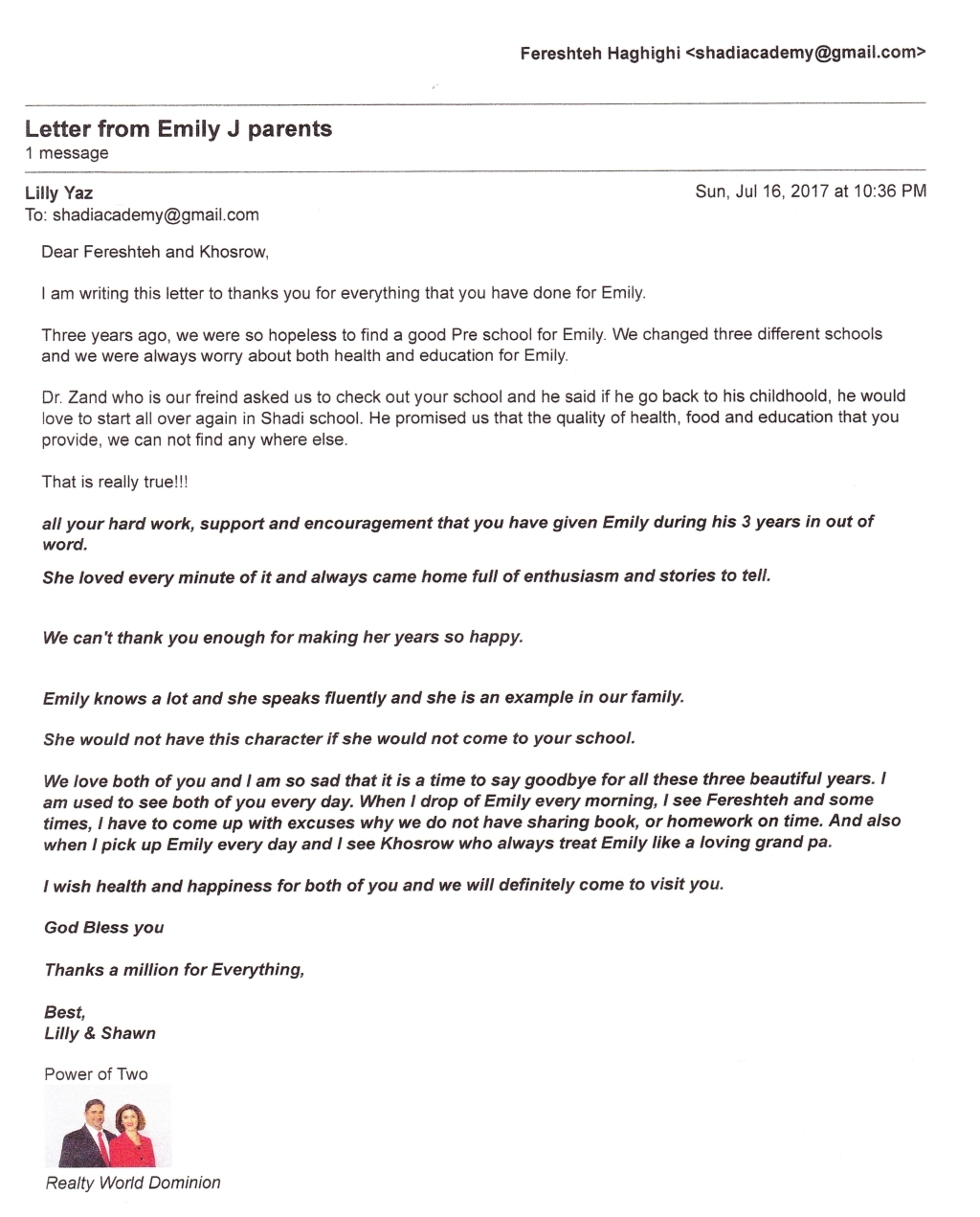 Dear Mrs. Fereshteh, Mr. Khosrow & Ms. Liliy,I am writing this letter to express our heartfelt appreciation for the exceptional care and nurturing environment that our daughter, Kiana, experienced while attending Shadi Academy.